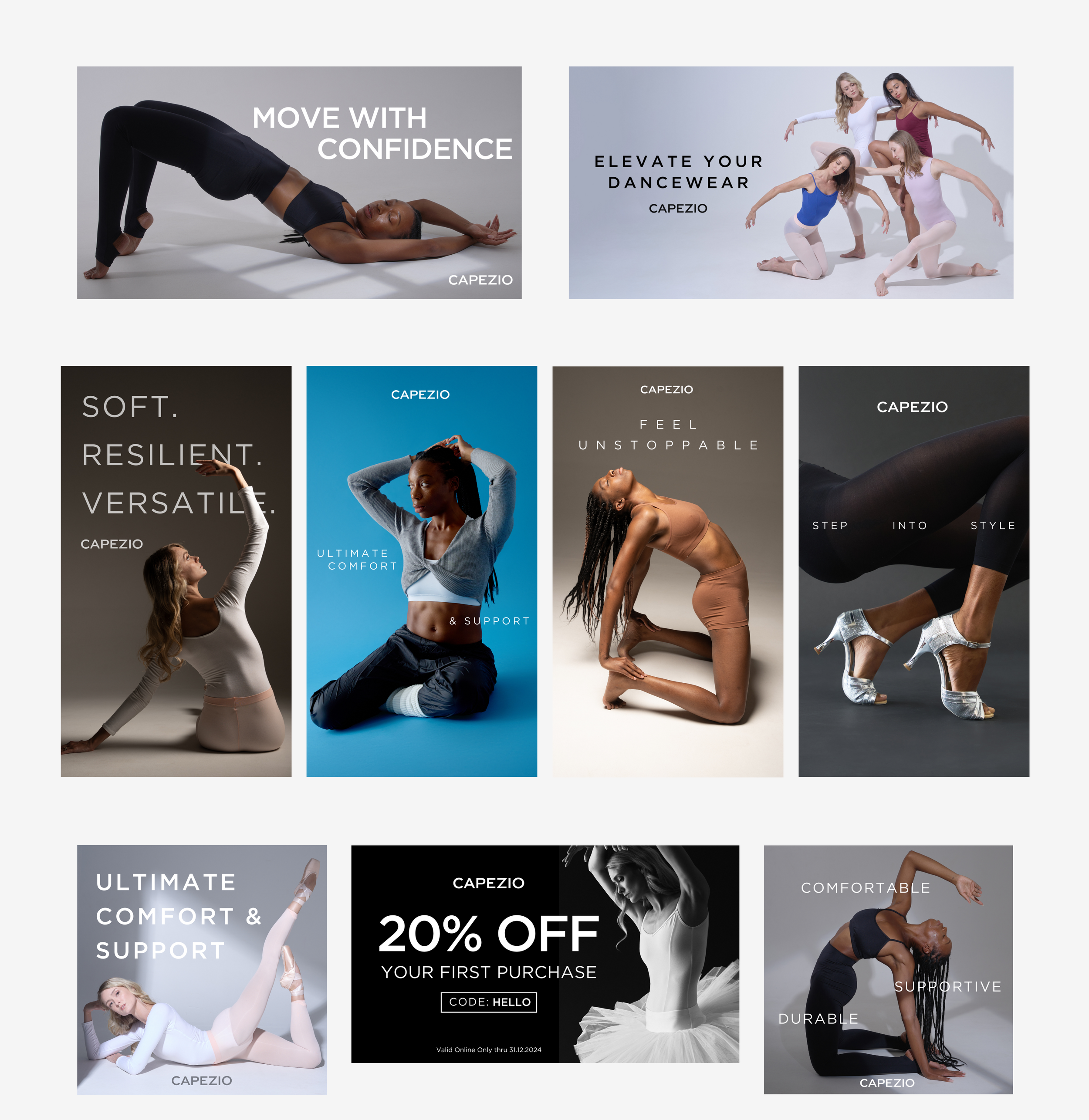 As a graphic designer at CAPEZIO, I design a variety of print and digital assets for advertising campaigns, product artwork and packaging, fashion catalogs, promotional product videos, motion graphics, event booths for international dance conventions, and more.