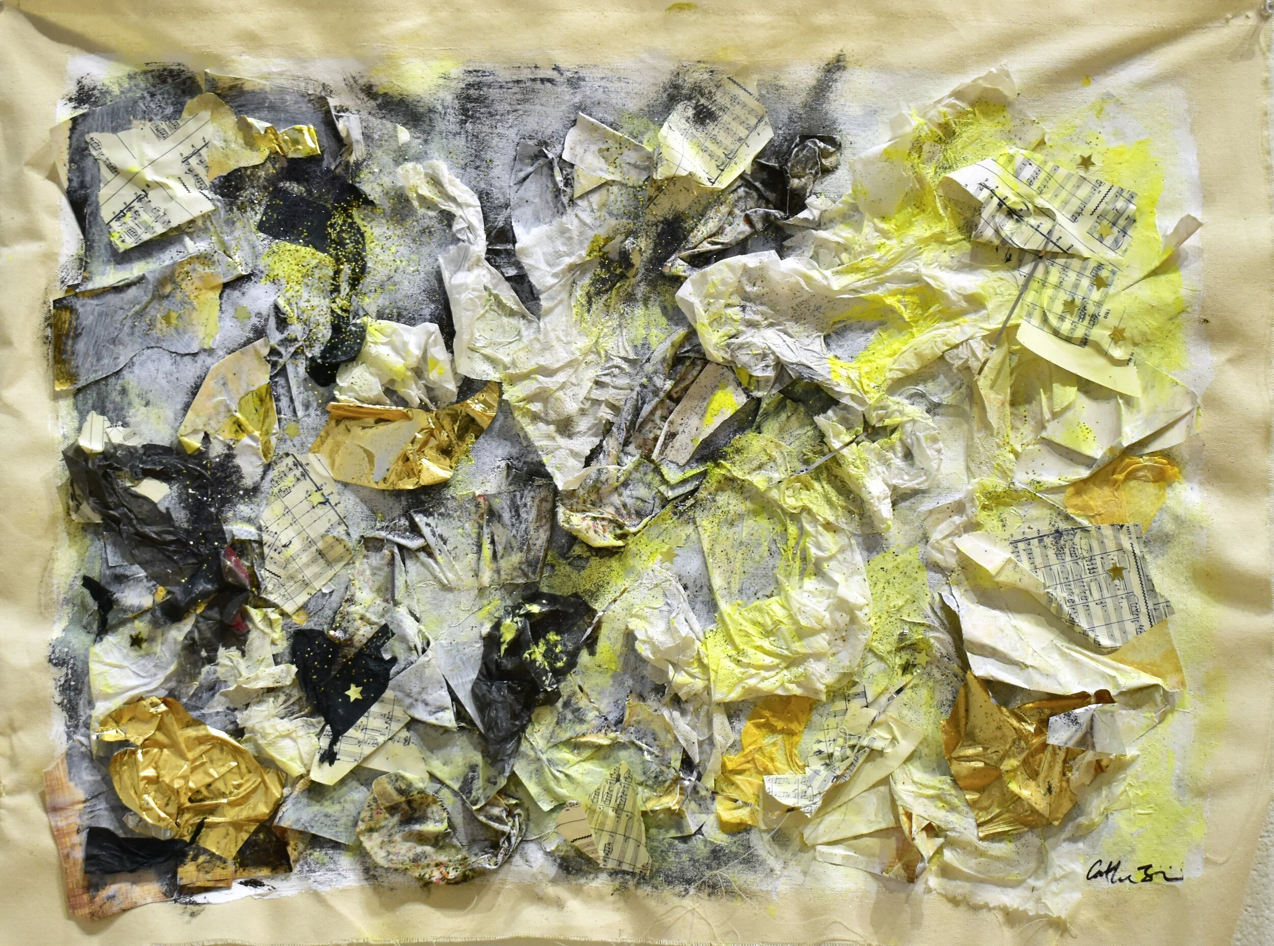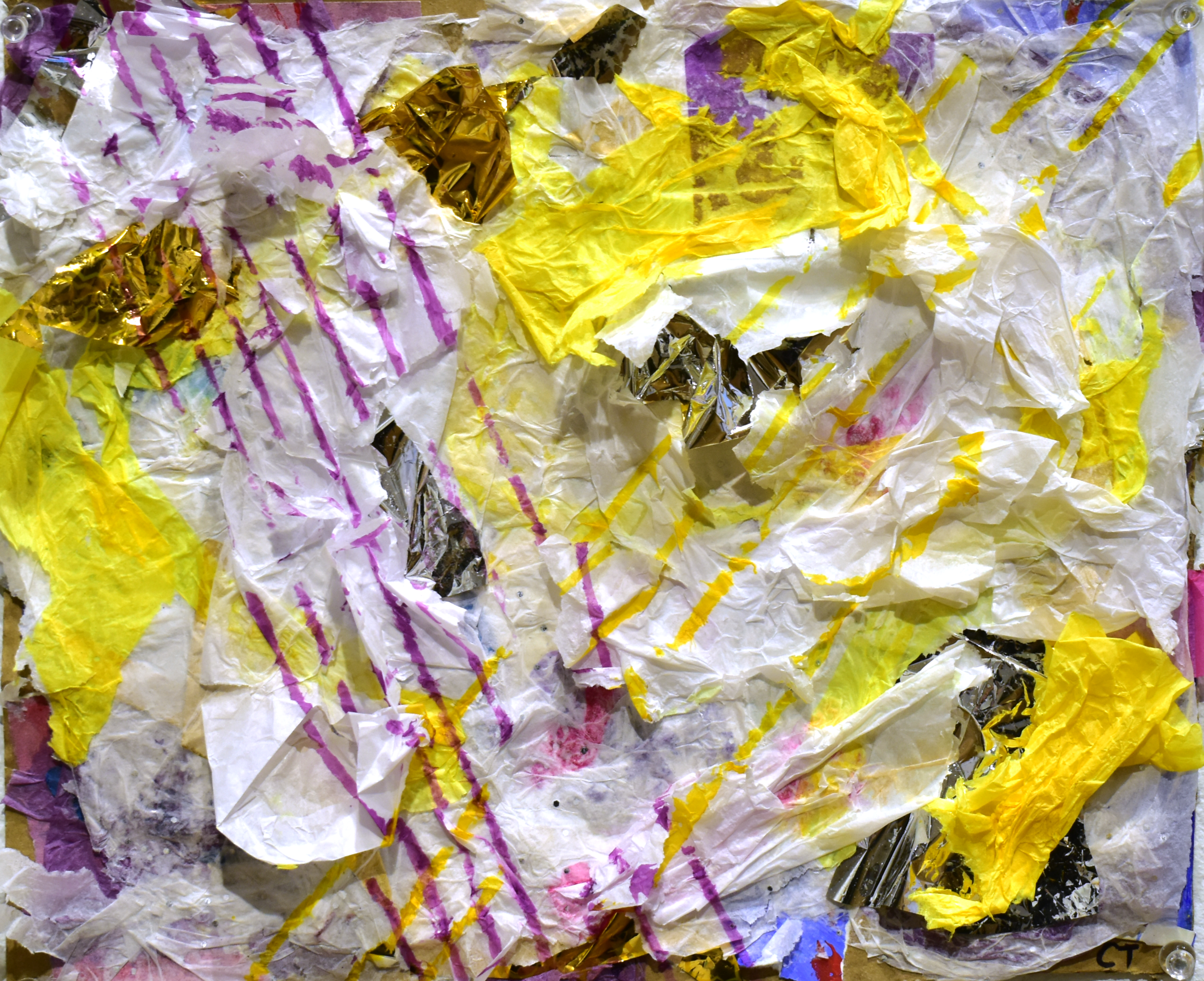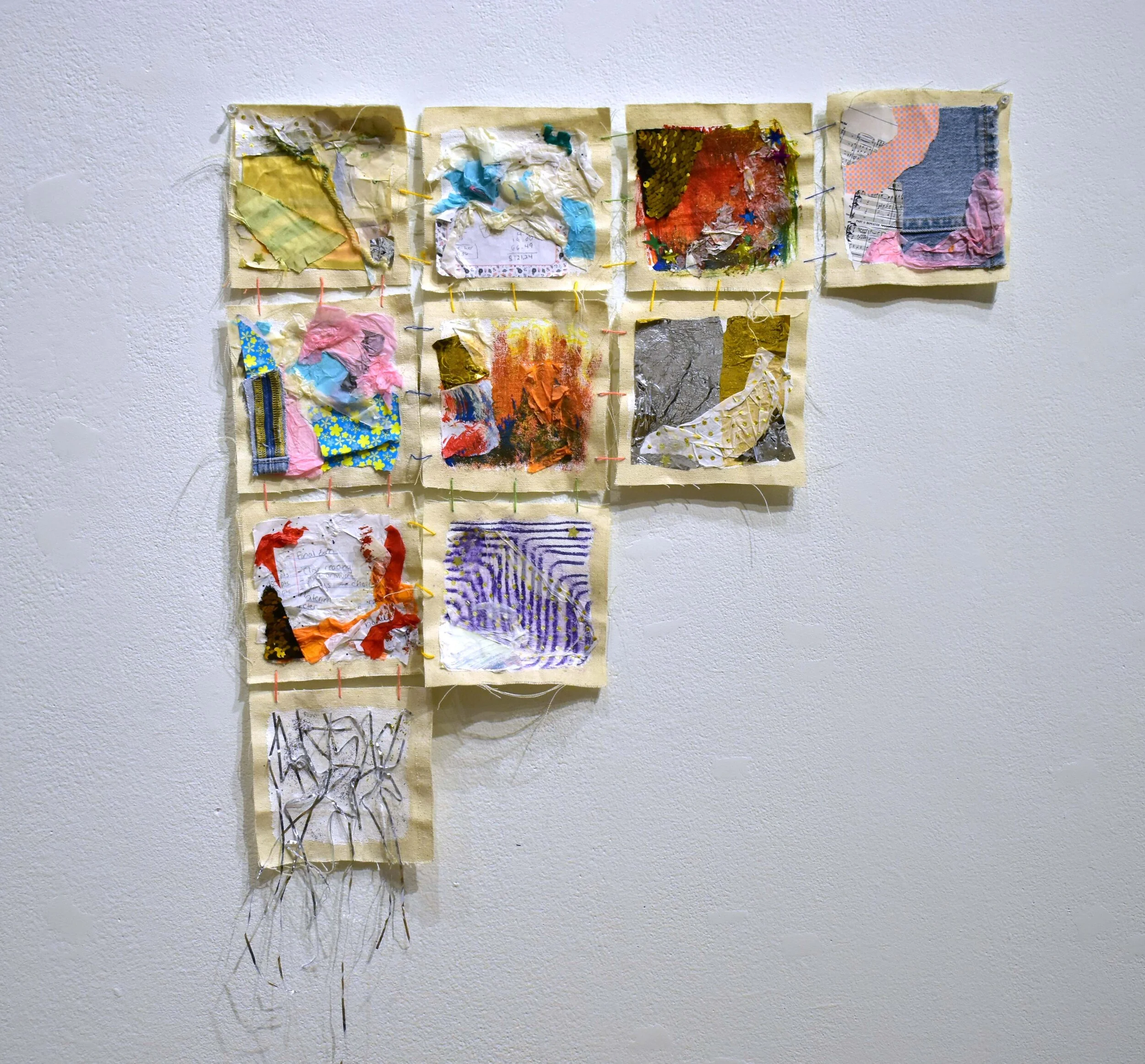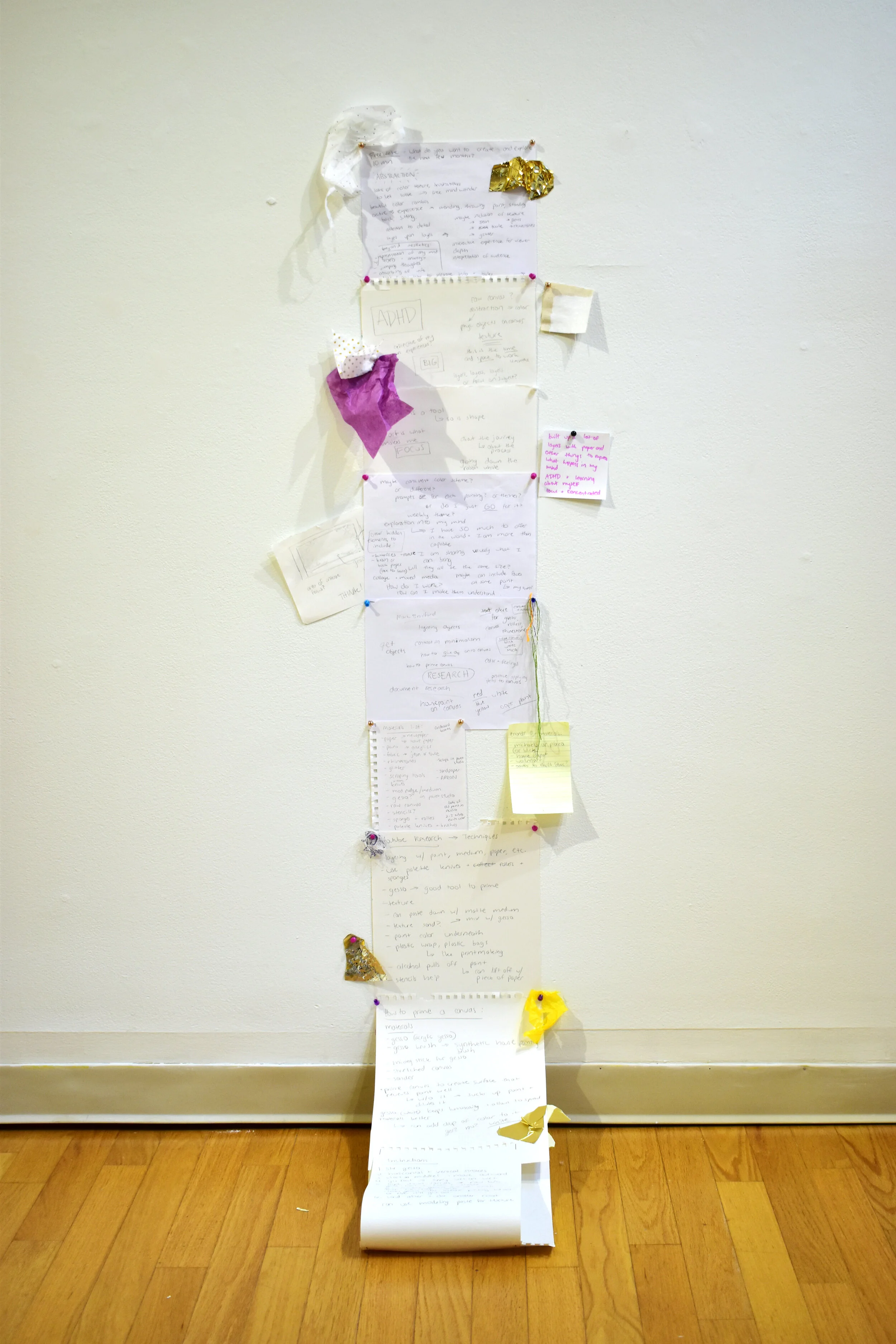 “As a person with ADHD, I often get overwhelmed by sounds, sights, and my own intrusive thoughts. I often abandon tasks as I fail to multitask and am unable to concentrate. Amidst the sensory overload, the knee-tapping, the distractions, and unfinished tasks that are products of ADHD, creating artwork is one of the very few things that keeps me consistently engaged. In this series of works, The Hyperactive Mind, I explore my relationship with ADHD through abstract artworks that visually convey the sensations of the condition. While recognizing that each person that has ADHD has a unique experience, these works address my experiences with sensory overload, hyperfocusing, distraction, anxiety, and overwhelming feelings. I focused on exploring surface and texture by combining media to create complex, dynamic surfaces with shifting focal points in order to embody the distracted mind. The contrast between negative and positive space, chaos and stillness, and the overwhelming versus the quiet, which are all reflective of my experiences, is exhibited throughout this series. This block of work has had an emphasis on process and the collection of materials such as tissue paper, glitter, notes, fabric, and more, to visually embody my experiences and the complexity of my emotions. Using these materials and applying them in a strategic way allows an opportunity for neurotypical viewers to gain insight into the mind of a non-neurotypical person, and to potentially recognize commonalities between us.”